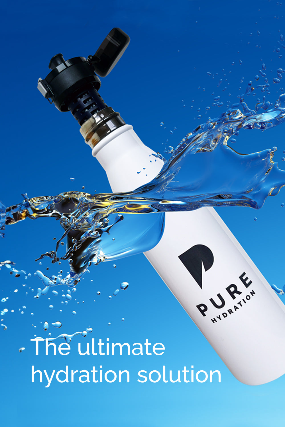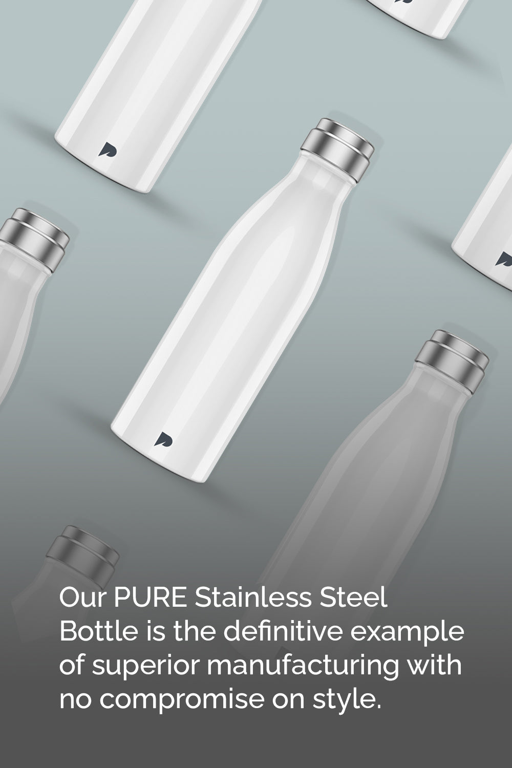 Design Base colour: white. Design: full colour, with PURE logo on bottle. Cap: stainless steel with PURE BOTTLE logo.